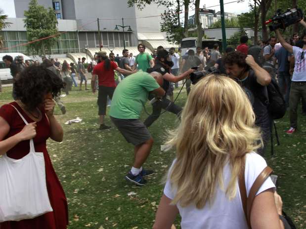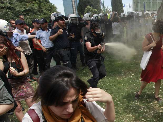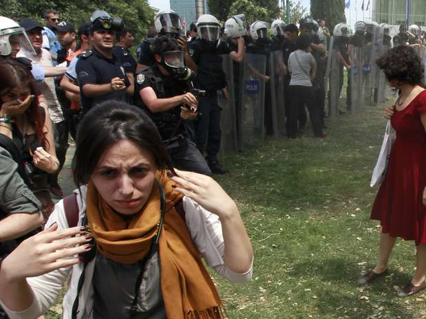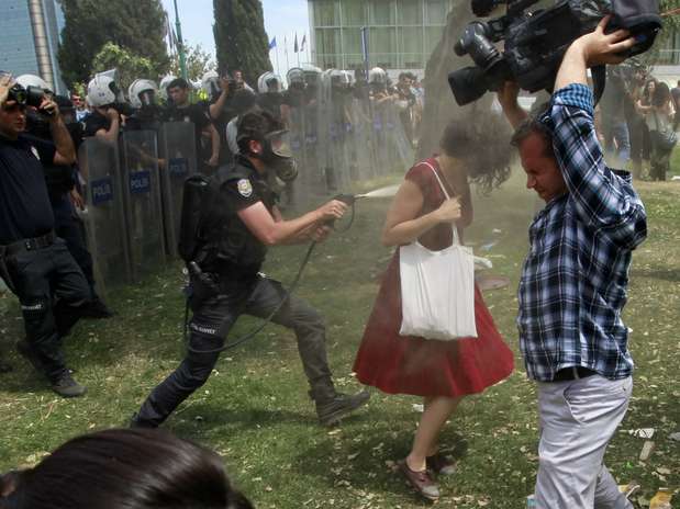 Policial borrifa gás lacrimogêneo na direção da mulher do vestido vermelho durante protesto contra a destruição de árvores na Praça Taksim, em Istambul, em 28 de maio. Imagens da mulher feitas pelo fotógrafo Osman Orsal foram compartilhadas viralmente nas redes sociais e se tornaram símbolo dos recentes protestos na Turquia