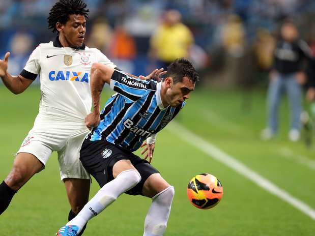 Como alardeado antes da partida, o Corinthians começou com uma postura ofensiva o duelo contra o Grêmio e partiu para cima logo no primeiro minuto. O time da casa, contudo, passou a ter o domínio do jogo com o avanço do confronto e chegou a pressionar os alvinegros – teve até uma sequência de escanteios seguidos antes dos 15min. Aos 18min, na principal jogada do primeiro tempo, Kleber foi lançado na área, chutou cruzado para defesa de Walter e, na sobra, Vargas, em chance clara, isolou por cima do gol.